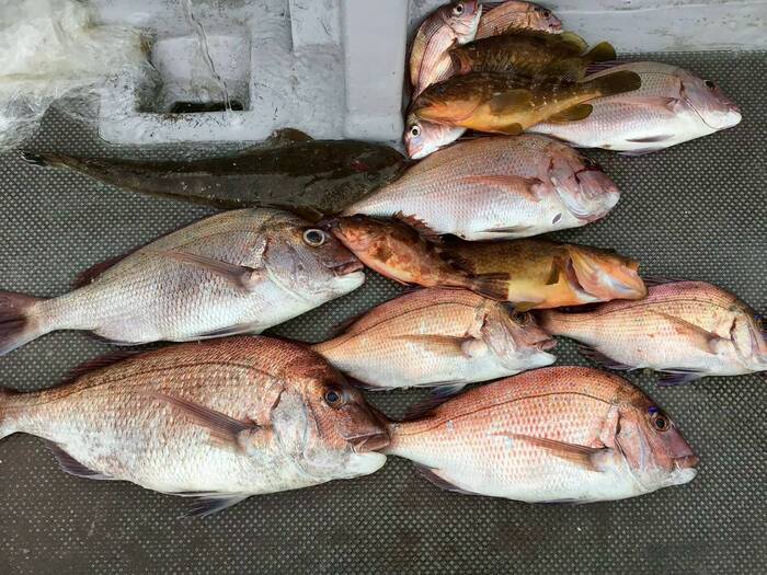 感謝來自日本福岡秀幸丸專業釣船的平岡船長,首次使用莎美產品的心得: 我們有幸與台灣釣具製造商-莎美釣具合作,今天我們開始試用。 釣竿STR-C64M和武士鯛ラバ游動丸的效果很好,深受玄界灘真鯛的喜愛。 今天是我們遠洋之旅的開始,包括放生的在內我們捕獲了30多條真鯛。 下圖是一個人釣獲的數量。
