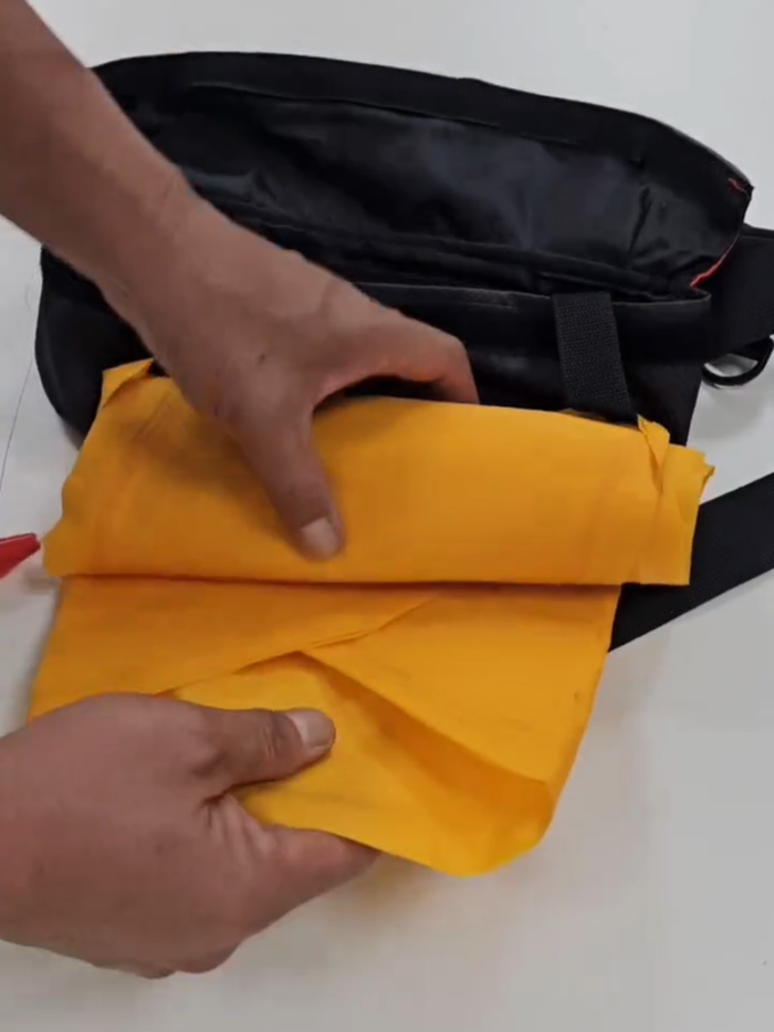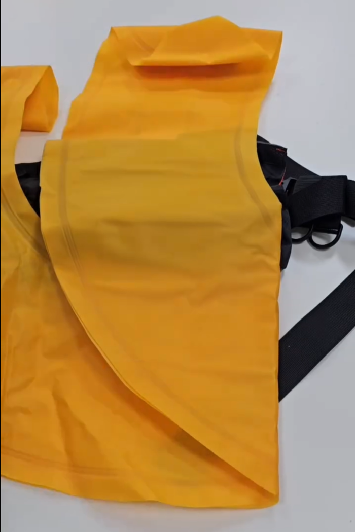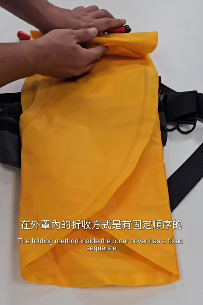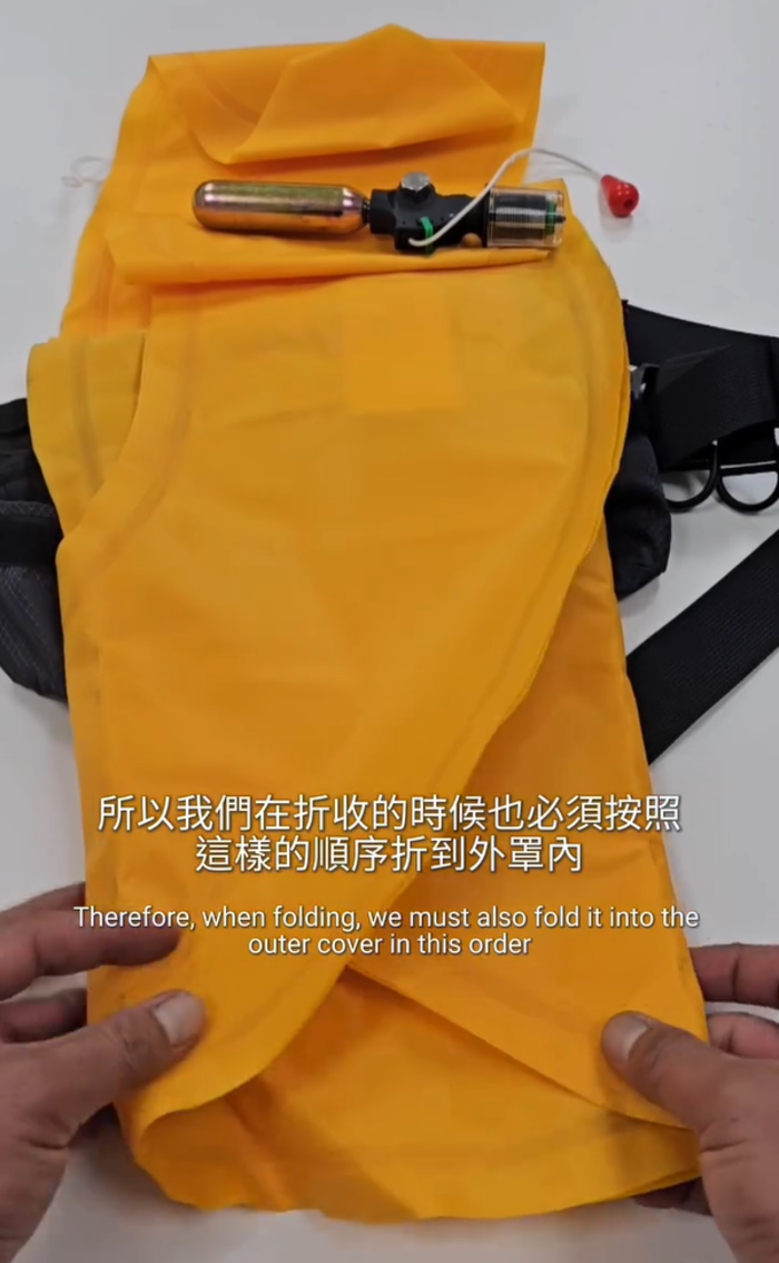 再來就是要收摺好並正確的放回外袋內,才不會造成因裝著不正確而導致下次爆開後救生圈無法正常展開甚至斷裂。