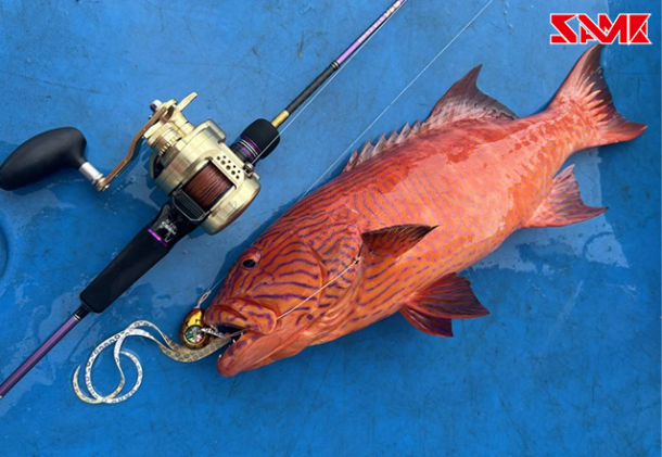 莎美馬來西亞測試員力古在洛克尼亞海域,近期使用: 莎美武士游動丸實心竿STR-C64M+莎美武士PE#2號+武士TC游動丸+魔幻大捲曲飄帶, 在淺場屢屢釣獲許多漂亮漁獲!