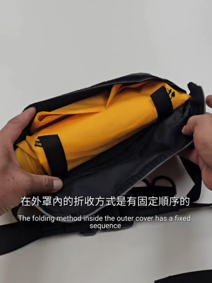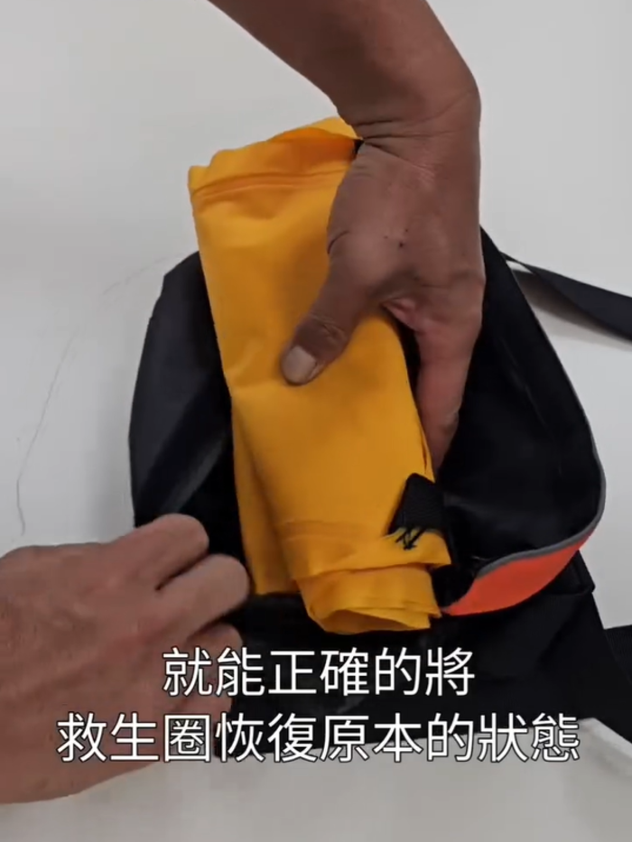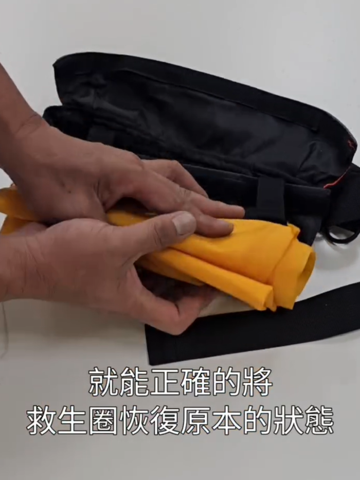再來就是要收摺好並正確的放回外袋內,才不會造成因裝著不正確而導致下次爆開後救生圈無法正常展開甚至斷裂。