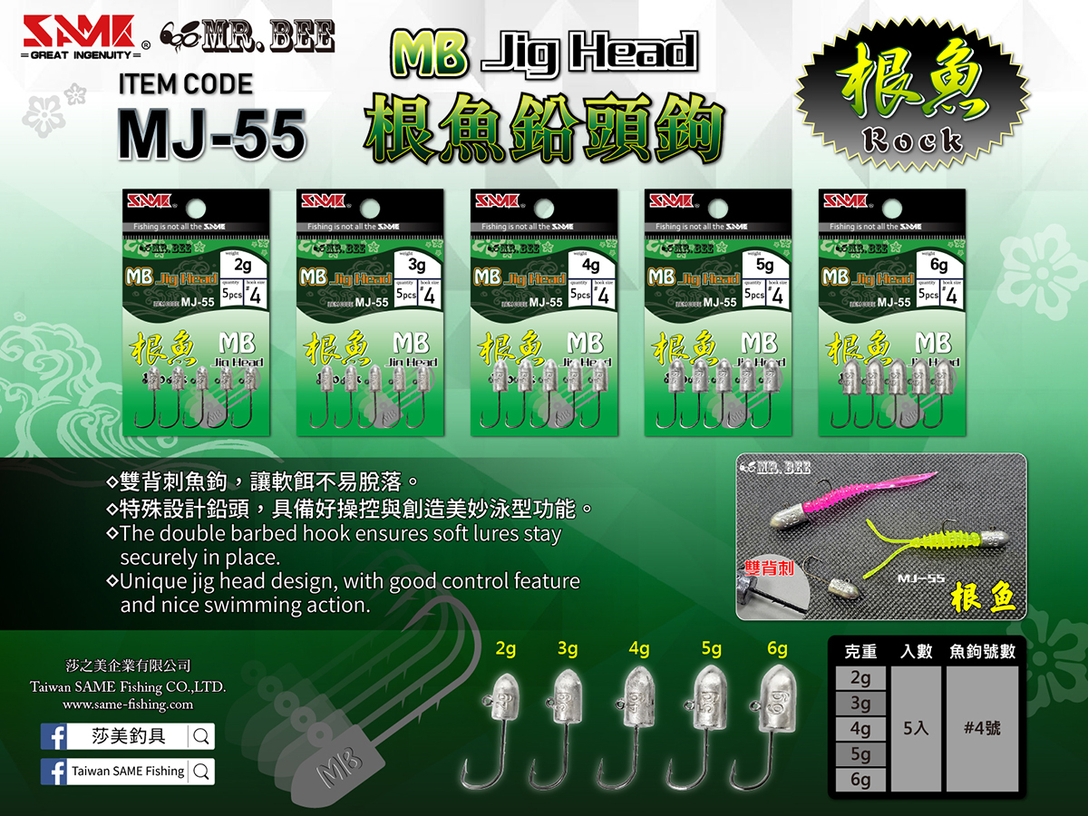 MJ-55根魚鉛頭鉤 ◇雙背刺魚鉤,讓軟餌不易脫落。 ◇特殊設計鉛頭,具備好操控與創造美妙泳型功能。 ◇The double barbed hook ensures soft lures stay securely in place. ◇Unique jig head design, with good control feature and nice swimming action.